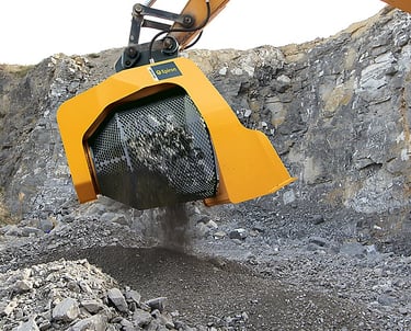 Materialet passerer gjennom sekskantede åpninger i nettet og blir til høykvalitets fraksjoner av stein, knust betong eller resirkulert materiale – direkte på arbeidsstedet.